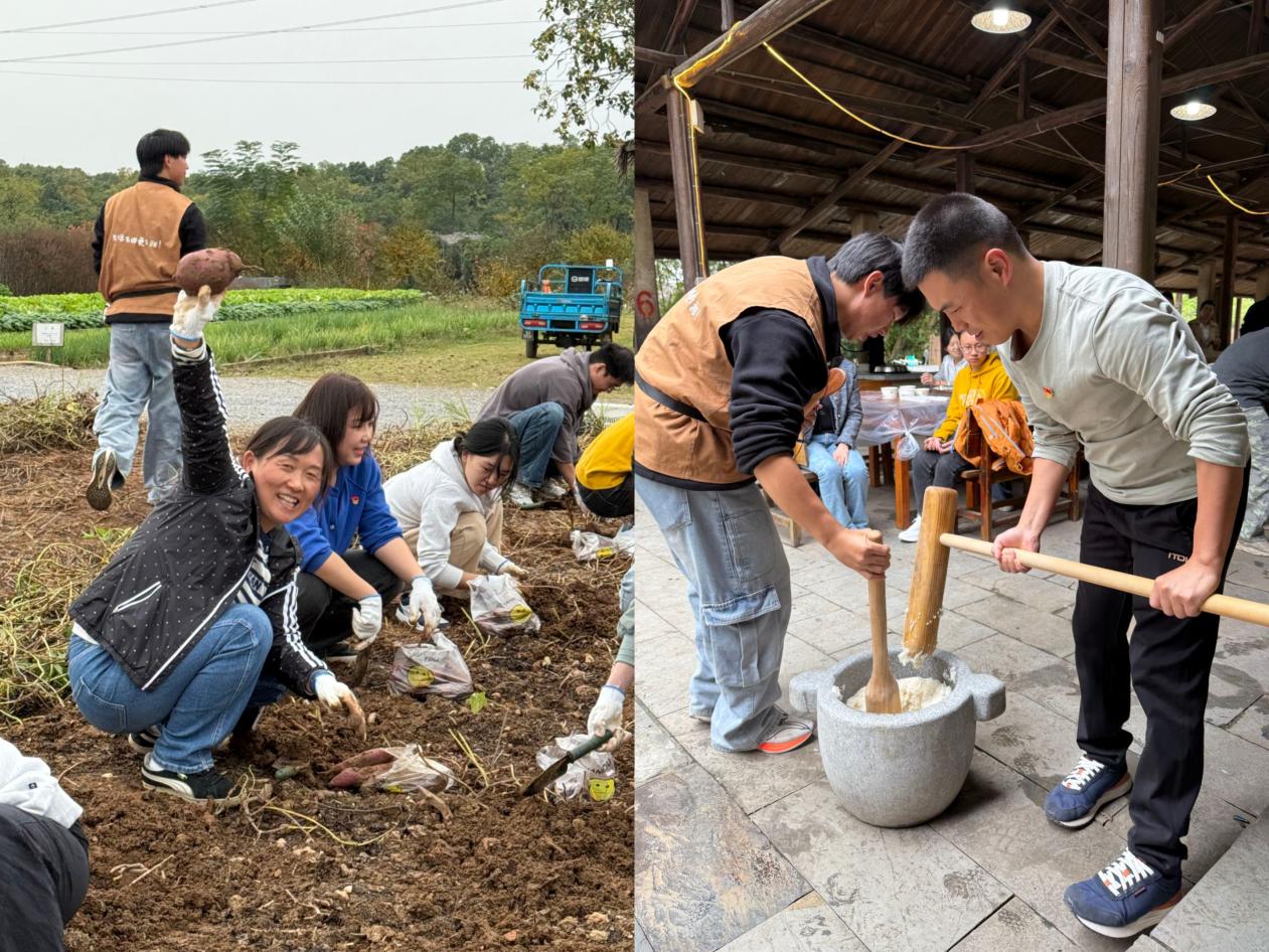 活动现场,师生党员热情高涨。打糍粑时,大家分工协作,教工掌槌控节奏,员工翻拌糯米,木槌撞击声与笑声交织。品尝着热糍粑,师生既体会到协作的力量,也传承了传统农耕智慧。在紫薯种植基地,师生党员们化身“农耕实践者”,在农技人员的指导下,手持小铲俯身田间,小心翼翼地拨开土壤,当一个个饱满的紫薯带着泥土的芬芳被挖出时,现场响起阵阵欢呼。“平时在实验室与数据打交道,今天在田间感受‘春种秋收’的自然法则,才真正理解‘每一份收获都来之不易’的道理。”统计学研究生党员李同学捧着亲手挖出的紫薯感慨道。教工党员们则结合自身工作经历,在劳动间隙与研究生交流职业规划,将思想引领融入田间地头的轻松对话中,实现了“劳动实践+思想引领”的有机融合。