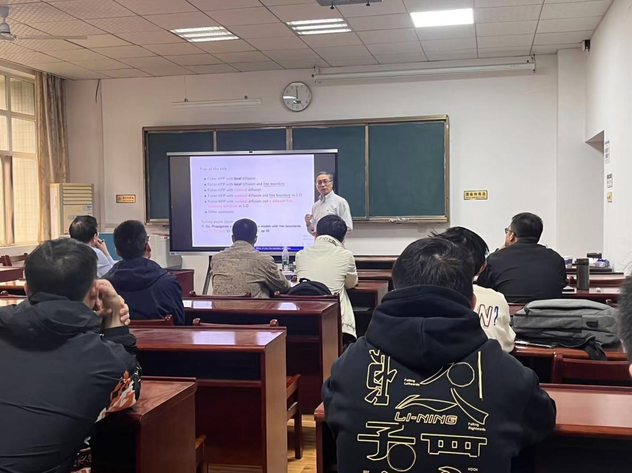 在报告中,杜一宏教授首先回顾了一些与种群传播相关的微分方程模型,比如Fisher-KPP模型,讲述了反应扩散方程发展历程,介绍了局部扩散和非局部扩散模型。接着,提出了带自由边界条件的Fisher-KPP方程,并解释了与局部扩散模型的区别与改进之处。最后,杜教授介绍了团队最近的主要相关研究工作,他们考虑了变化的自由边界对种群传播速度的影响,刻画了种群在空间中的传播速度及密度函数随时间t和环境的变化。