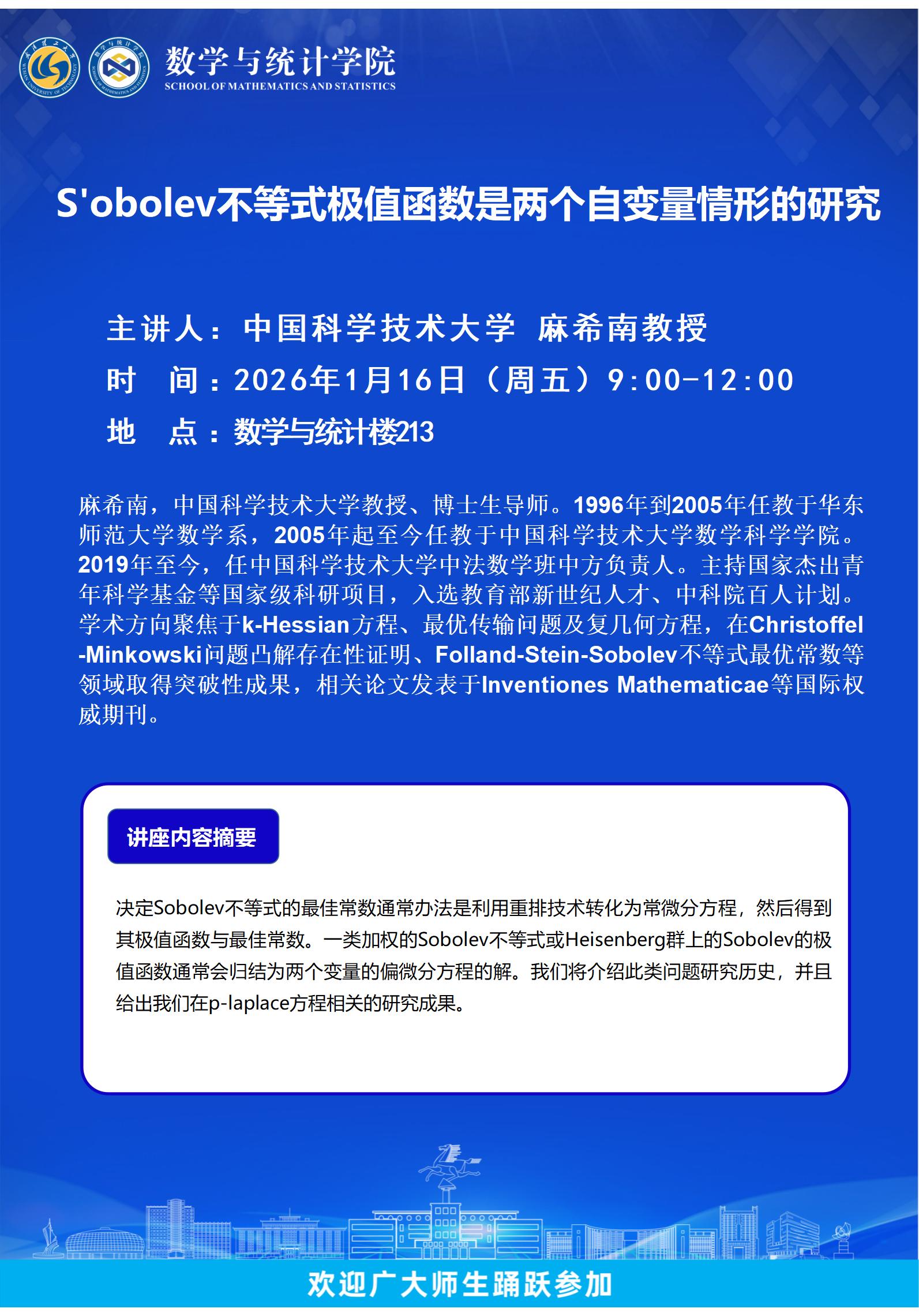 中国科学技术大学 麻希南教授-S'obolev不等式极值函数是两个自变量情形的研究
