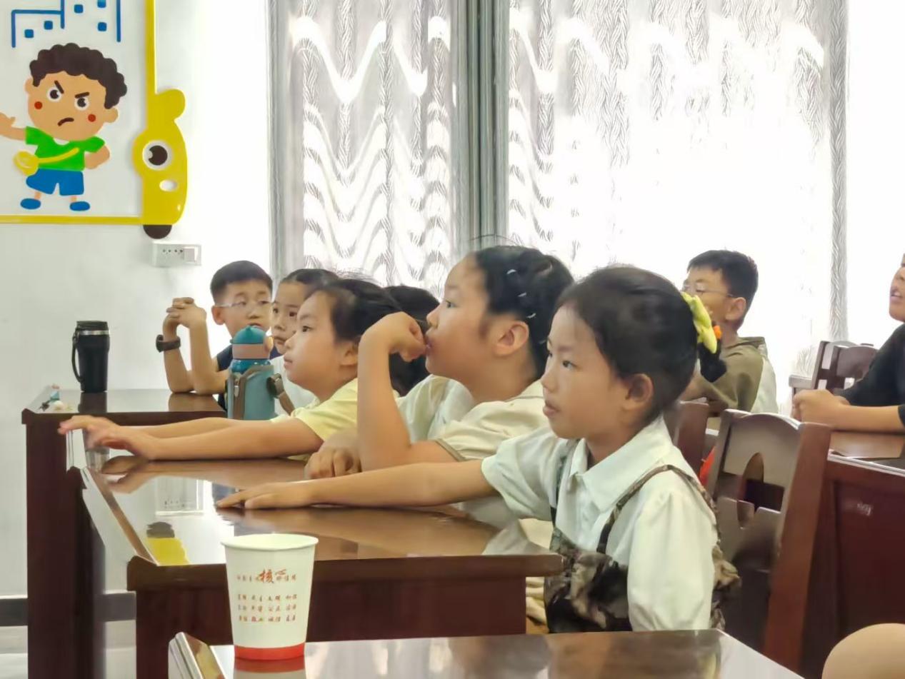 在志愿者文俊庭和张鉴宜的带领下,音乐课堂正式开启。课程伊始,两位志愿者运用生动有趣的方式,向孩子们介绍了音乐基础知识,从节拍的感知到五线谱的识别,复杂的乐理知识在轻松愉快的氛围中变得通俗易懂。孩子们聚精会神,跟随节奏拍手跺脚,积极回应,教室里充满了跃动的音符。