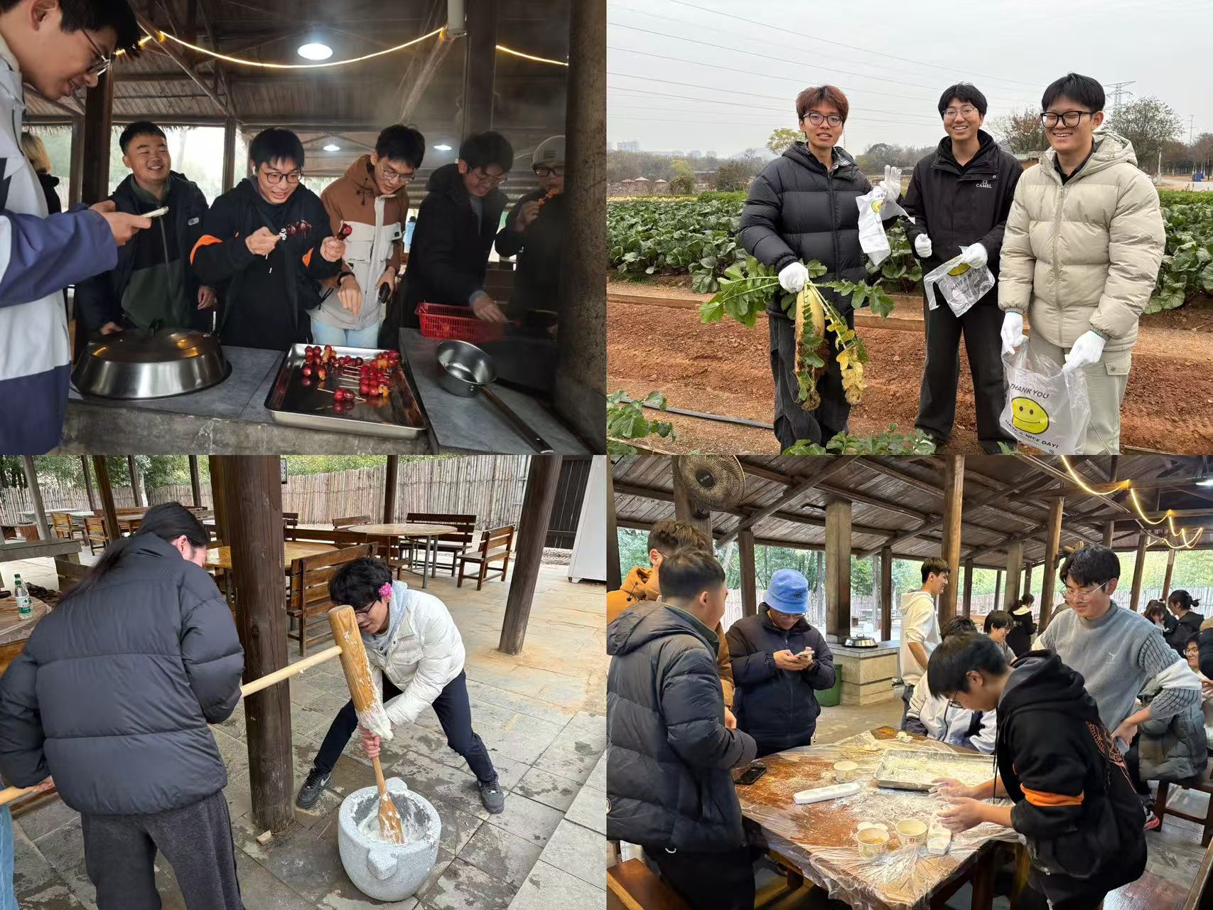在“打糍粑”课程中,同学们两人一组紧握木杵协同捶打,在“一二一”的号子声中体验团队协作的力量,并在创意塑形中感受劳动创造的乐趣。最后,师生们走进田间地头,亲手采收萝卜,丈量成果、合影留念,切实感受丰收的喜悦。